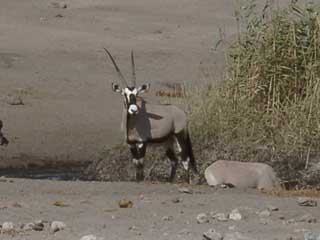 Wir hatten am Anfang echte Befürchtungen, das unsere Kameraausrüstung -- wie auf dem Whale Trail -- nicht ausreichen is, aber da alle Tiere sehr schön posieren und nahe genug herankommen, ist das glücklicherweise kein Problem. Hier im Bild ein Gemsbok (Oryx), die sich im allgemeinen sehr schüchtern geben aber spektakuläre Kämpfe abhalten.