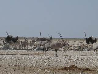 Am letzten Wasserloch haben wir dann noch eine Bunte Auswahl von Zebras, Oryx, Straussen und Impalas gesehen. Die Gemsböcke (Oryx) scheinen sowas wie die Stinkstiefel der Prärie zu sein, da sie mit Vorliebe alle anderen Tiere von der Wasserstelle vertreiben obwohl sie schon getrunken haben (Im Gegensatz zu den Elephanten, die nur beim trinken ihre Ruhe haben wollen).
