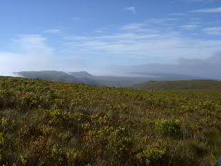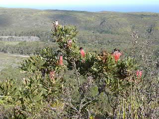 Wie dem auch sei, wir sind also wieder die Berge rauf und hatten wieder die schönsten Ausblicke in die Landschaft. Die Pflanzenwelt wechselt in dieser Gegend eigentlich ständig, so dass man auf jedem Kilometer auf neue Vegetation trifft. Einzig der Cape Sugarbird blieb uns die ganze Zeit erhalten. Bei dieser Art von Vogel ist der Schwanz länger als der Rest des Vogels. Vogel ist -- weil sehr schnell -- nicht mehr im Bild zu sehen.